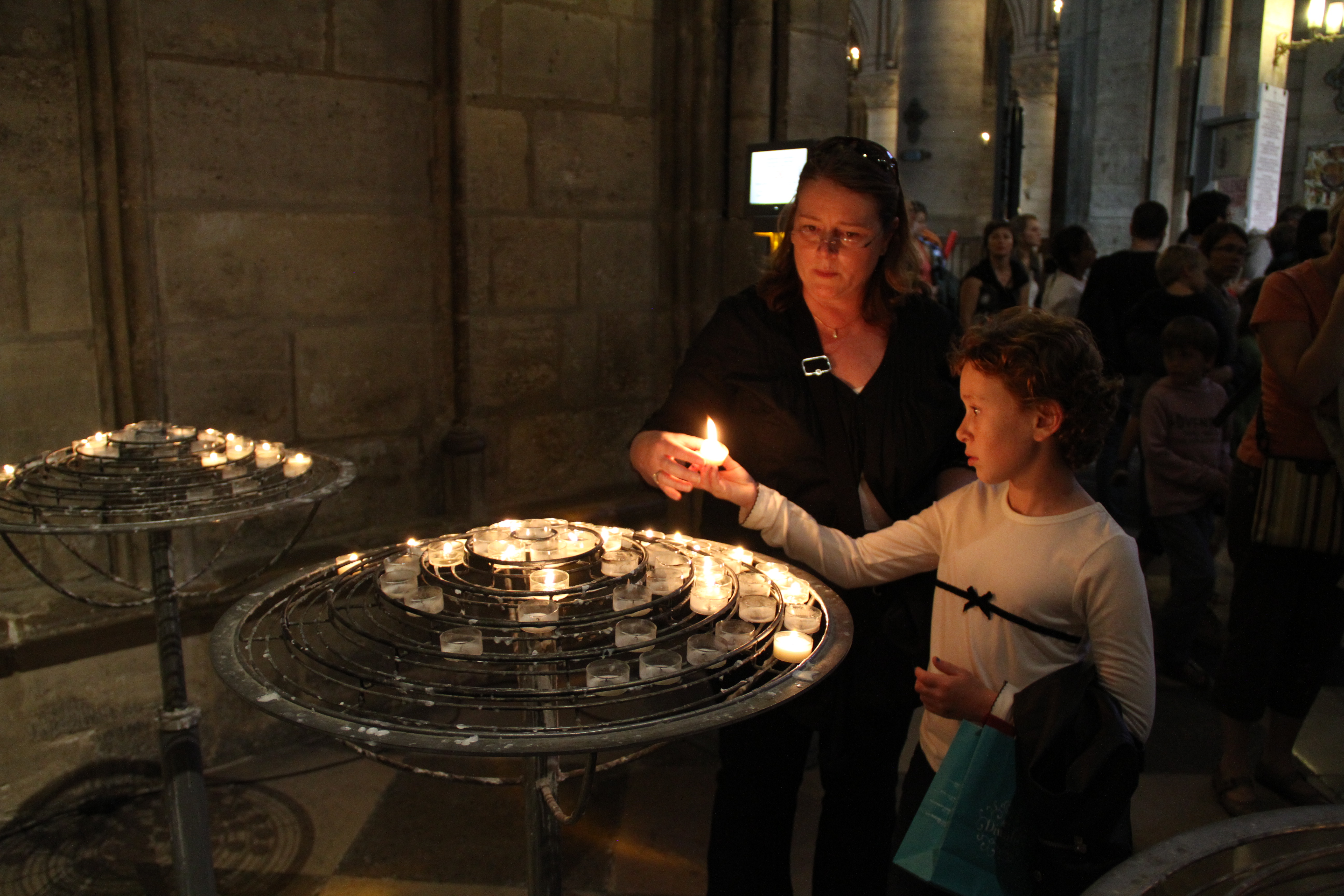 Kim and Sydney lighting a candle in Notre Dame